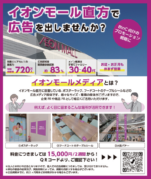 イオンモール直方に設置している、ポスターラック、フードコードのテーブルシートなどの広告メディア媒体です。様々なサイズ・種類の媒体がございますので、企業PRとして幅広く活用いただけます。